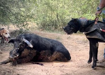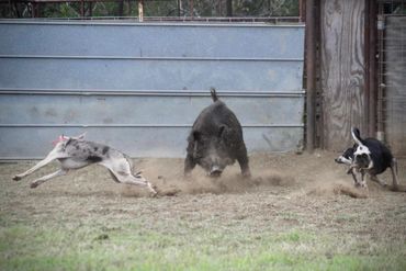 Dogs can put pressure on a group of hogs, forcing them to leave the area temporarily.This can provide time to plant crops or build fences.