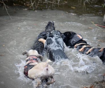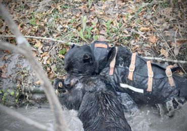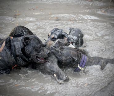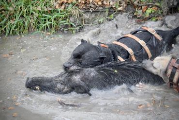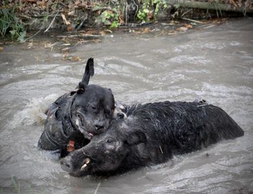 Hunting wild pigs with dogs is a strategy that has been practiced for hundreds of years. Today, hunting feral hogs with dogs is still a popular practice for sport, business, and feral hog management. In this method, dogs are trained to find, pursue, and contain a hog at bay until a hunter can catch up to them. Some hunters will also use a catch dog to physically hold the hog until the hunter arrives to dispatch it. Equipment for theses hunts often included GPS collars to monitor the location of the dogs and protective vests or collars to help keep the dogs safe while interacting with the pig.
